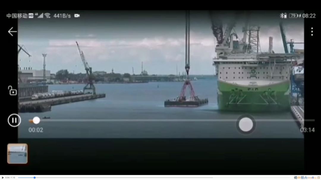 11”,船体受码头限制,左倾停止,吊臂继续转动。